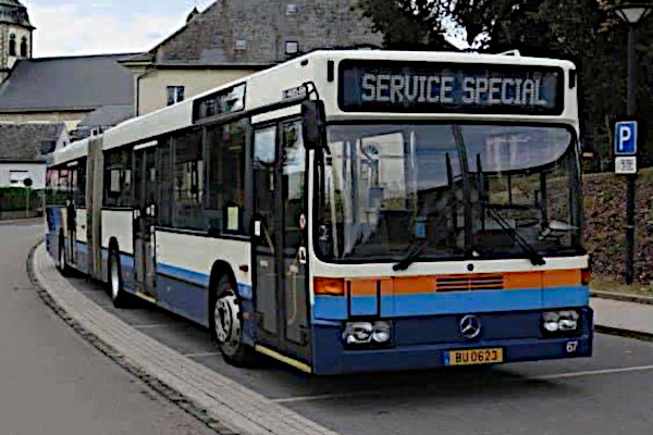 | | Baujahr: | 1997 | | | Hersteller: | Mercedes-Benz | Typ: | O 405 GN 2 | Aufbau: | ..wie Hersteller | Motor: | 447 hLA | Leistung/Hubr.: | 300 PS / 11967 ccm | Gewicht: | 15720 kg | Länge: | 17900 mm | Breite: | 2500 mm | Höhe: | 2900 mm | Plätze: | 48Sitz, 102Steh | | Vita: 1996 wurde eine Ausschreibung von 6 Niederflurbussen von der Stadt Luxemburg beschlossen. Der Hersteller Mercedes-Benz erhielt den Zuschlag. Geliefert wurden Busse des Typs O 405 GN2, die eine sehr große Niederflurbodenfläche im Fahrgastraum aufwiesen. Im Laufe der Jahre wurden auch diese Busse für den Betrieb mit Biodiesel umgebaut. Als letzter der Niederflurgelenkbusse war Bus 67 bis 2014 im Einsatz. Seitdem gehört er der Vereinigung Frënn vum ale stater bus und wird als Gelenkbus in den Farben von 1989 erhalten. Für sein Alter hat dieser Wagen sehr gute Laufeigenschaften mit einer sehr geringen inneren Geräuschkulisse.