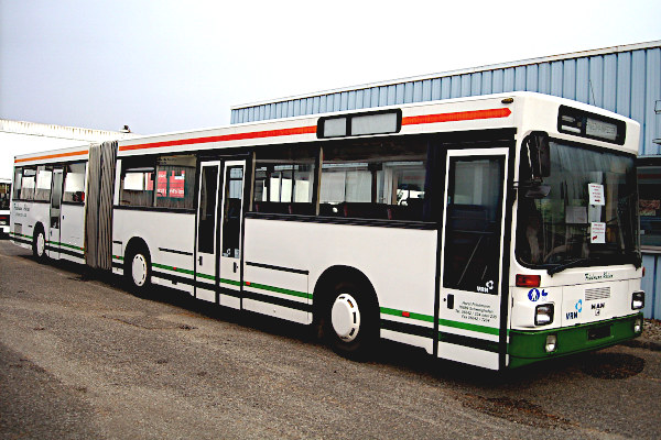 | | Baujahr: | 1993 | | | Hersteller: | MAN | Typ: | SG 292 | Aufbau: | Göppel | Motor: | MAN D2866 UM | Leistung/Hubr.: | 292 PS / 11967 ccm | Gewicht: | 14400 kg | Länge: | 17480 mm | Breite: | 2500 mm | Höhe: | 3050 mm | Plätze: | 68 | | Vita: MAN kam im Jahr 1985 mit den Modellen SG 242 H und SG 292 H auf den Markt. Die VÖV-Standard-Gelenkbusse der zweiten Generation waren die Nachfolger der Typen SG 240 H und SG 280 H. Wie die Vorgänger waren sie Gelenkbusse mit Heckmotor, bei denen die mittlere Achse über eine durch das Gelenk führende Antriebswelle mit Gleichlaufgelenk angetrieben wurde. Da kurze Zeit später der Schubgelenkbus SG 242 auf den Markt kam, wurden nur recht wenige Fahrzeuge dieses Typs verkauft. 1990 wurde die Produktion eingestellt und nur noch der MAN SG 242 bzw. 292 angeboten. Ein solcher MAN SG 292 findet sich im Bestand des Vereins Autocars Anciens de France, denn auch in Frankreich waren die 17,5 Meter langen Gelenkbusse wegen der besseren Manövrierfähigkeit beliebter als 15 Meter lange Solowagen.