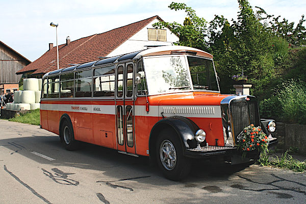 | | Baujahr: | 1966 | | | Hersteller: | FBW | Typ: | C40 | Aufbau: | Lauber | Motor: | | Leistung/Hubr.: | PS / ccm | Gewicht: | kg | Länge: | mm | Breite: | mm | Höhe: | mm | Plätze: | 32 | | Vita: Bei der Nüssli AG in Agasul existieren zwei Oldtimerbusse des schweizer Herstellers FBW (Franz Brozincevic Wetzikon). Neben einem Frontlenker C40U von 1956 wird dort auch dieser FBW C40 erhalten, der 1966 erstmals in Betrieb genommen wurde. Erstbesitzer des Haubenwagens war der Postautohalter (PAH) Bernard Périsset aus Rue im Kanton Freiburg. Dieser Bus war auf einem privat betriebenen Linienkurs im Einsatz. Deshalb unterscheidet er sich farblich von den zeitgenössischen Postautos, die einheitlich gelb lackiert waren. Der Bus bietet 32 Reisegästen einen Sitzplatz. Er wird vermietet für Hochzeiten, Familienanlässe und andere Sonderfahrten. Eine Fahrt mit den Nüssli-Oldtimern verleiht jedem Anlass eine nostalgische Note und hinterlässt bei den Fahrgästen einen bleibenden Eindruck. |