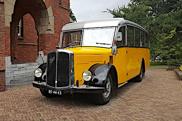 | | | | | Baujahr: | 1953 | | | Hersteller: | Saurer | Typ: | L4C | | Aufbau: | ..wie Hersteller | Motor: | Saurer CT2D | | Leistung/Hubr.: | 125 PS / 8720 ccm | Gewicht: | 7270 kg | | Länge: | 9600 mm | Breite: | 2250 mm | | Höhe: | 3000 mm | Plätze: | 30 | | Vita: Dieser Saurer L4C, dessen Aufbau ebenfalls von Saurer stammt, begann seine Laufbahn 1953 bei einem Postautohalter in der Schweiz. Nach mehreren Standortwechseln gelangte der Bus schließlich zur Firma Twerenbold in Baden-Rütihof. Dort wurde er unter dem Firmennamen Kontiki Londonbus- und Oldtimerfahrten für besondere Anlässe eingesetzt. Die SVA lernte den Bus bei einem Besuch bei Twerenbold kennen. Da schon länger nach einem solchen Exemplar gesucht worden war, wurde der Bus erworben. Zusammen mit einer großen Lieferung von Ersatzteilen traf der Saurer Ende 1998 aus eigener Kraft in den Niederlanden ein. Es brauchte einige Zeit, um ihn aufzuarbeiten und für eine niederländische Zulassung herzurichten. Seitdem steht er für Hochzeitsfahrten und zu besonderen Anlässen zur Verfügung. |