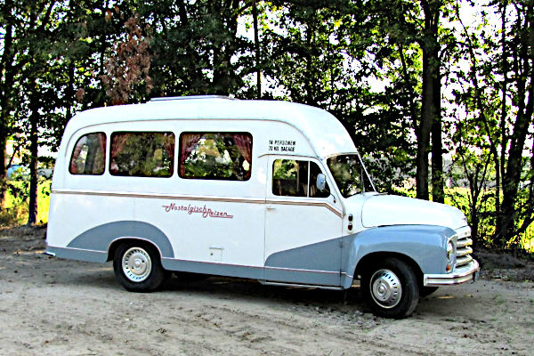 | | | | | Baujahr: | 1958 | | | Hersteller: | Opel | Typ: | Blitz 1,75 t | | Aufbau: | unbekannt | Motor: | Opel 6 Zylinder Benzin | | Leistung/Hubr.: | 58 PS / 2500 ccm | Gewicht: | 2700 kg | | Länge: | 6200 mm | Breite: | 2050 mm | | Höhe: | 2700 mm | Plätze: | 14 | | Vita: Im Jahr 2003 konnten Corin und ihr Mann Theo Sweegers diesen 1,75-Tonner Opel Blitz von einem Busunternehmen im niederländischen Tiel kaufen. Damals sollte der ebenfalls in der Opel-Sammlung der Sweegers vorhandene Weichblitz mit Domburg-Aufbau umfangreich restauriert werden. Da er einige Zeit lang ausfiel, wurde dieses Fahrzeug als vorübergehender Ersatz beschafft. Ob der Blitz immer schon als Bus im Einsatz war, oder ob er zuvor evtl. ein Krankentransportfahrzeug war, war nicht mehr festzustellen. Nachdem die Restaurierung des Domburg-Blitzes abgeschlossen war, verblieb dieser Blitz bei den Sweegers. Im Jahr 2011 konnte ein weiterer Opel Blitz-Bus, diesmal mit Kässbohrer-Aufbau von Arie Braam aus Ooij übernommen werden. Seitdem gibt es ein Blitz-Bus-Trio im Sweegers-Fuhrpark. |