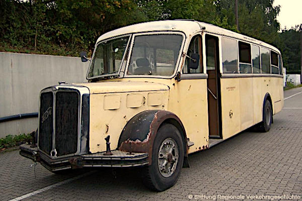| | | | | Baujahr: | 1951 | | | Hersteller: | FBW | Typ: | ON50 | | Aufbau: | Ramseier & Jenzer | Motor: | ED | | Leistung/Hubr.: | PS / ccm | Gewicht: | kg | | Länge: | 10700 mm | Breite: | 2400 mm | | Höhe: | 2920 mm | Plätze: | 32Sitz, 23Steh | | Vita: Der Verkehrshistorischen Arbeitsgemeinschaft war es 2005 gelungen, diesen FBW zu erwerben und nach Wuppertal zu holen. Der FBW war 1951 der erste Bus, der mit dem neuen leistungsstärkeren ED Motor ausgestattet worden ist und gehört mit seinen 145 PS zu den sogenannten "Normallenker" Großraumwagen. Das Fahrzeug wurde anschließend bei Ramseier & Jenzer in Bern karossiert. Mit Druckluft-Falttüren, elektrischem Schiebeverdeck, teilweise versenkbaren Seitenscheiben sowie Heck- und linker Seitentüre ausgestattet ist der rechtsgelenkte Alpenwagen für deutsche Verhältnisse sicherlich ein Hingucker. Der FBW wurde von H. Schregenberger und Co., Degersheim (Kanton St. Gallen) angeschafft. Er war im Linienbetrieb zwischen Flawil SBB und Degersheim an der Südostbahn unterwegs. Nach seiner aktiven Zeit gelangte er Ende der siebziger Jahre im Rahmen einer Erdbebenhilfe nach Friaul in Oberitalien. Bis zur Bergung durch einen Schweizer Sammler verblieb der Wagen anschließend als Unterkunft für einen Sportflugplatz in Italien. Der Bus wird derzeit in Wuppertal restauriert (Stand 2022). |