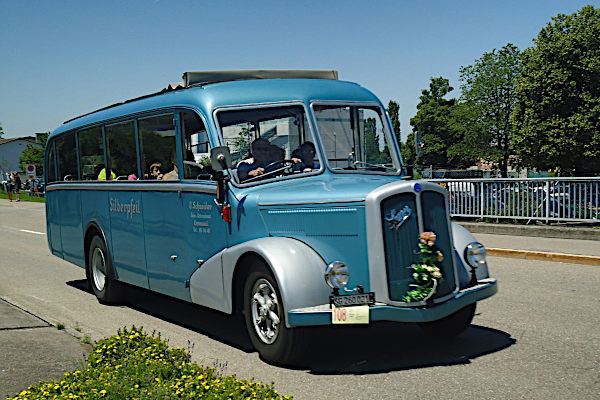 | | | | | Baujahr: | 1949 | | | Hersteller: | Saurer | Typ: | L4C | | Aufbau: | Lauber | Motor: | CT1D | | Leistung/Hubr.: | 100 PS / 7980 ccm | Gewicht: | 9800 kg | | Länge: | 9560 mm | Breite: | 2250 mm | | Höhe: | 2600 mm | Plätze: | 29 | | Vita: Dieser Saurer L4C mit Aufbau der Firma Carrosserie Lauber SA aus Prangins verkehrte von Dezember 1949 bis Dezember 1971 hauptsächlich als Kurswagen in Diensten von Carreisen Schneider auf der Strecke Rapperwil - Jona - Eschenbach - Ermenwil - Rüti. In dieser Zeit legte er 826.416 Kilometer zurück. 1972 war seine Zeit als "Silberpfeil" abgelaufen. Der Bus wurde außer Betrieb genommen und verkauft. Seine neue Nutzung war die als Baustellenbüro. 1986 besannen sich die Schneiders ihres alten Busses und kauften ihn zurück. Es folgte eine ausführliche und aufwändige Restaurierung. Seitdem ist er wie sein zehn Jahr älterer Schwesterbus, ein Saurer 1C für Oldtimerfahrten im Einsatz. |